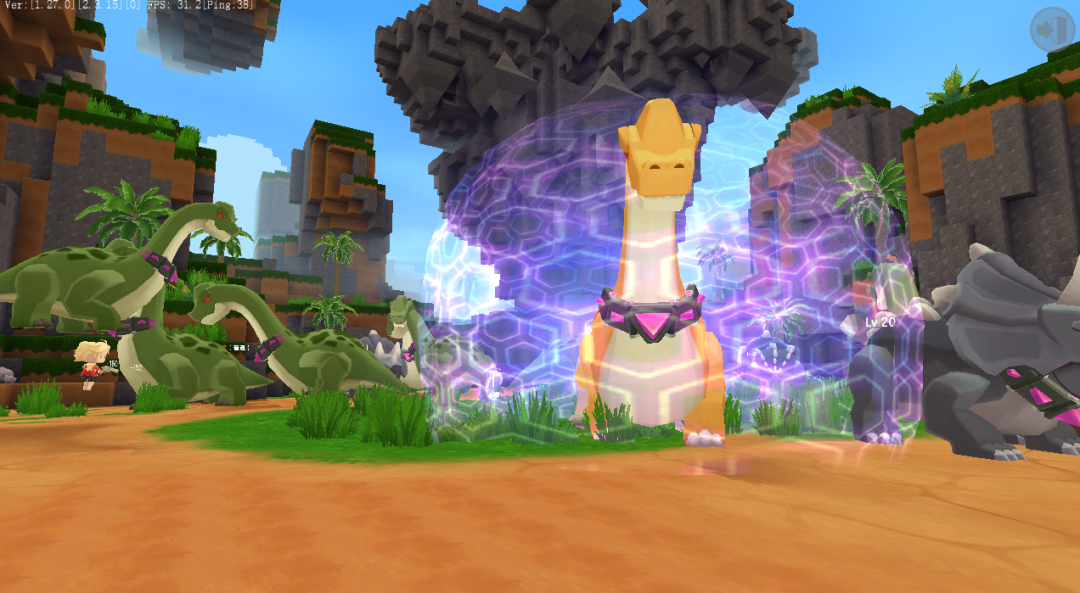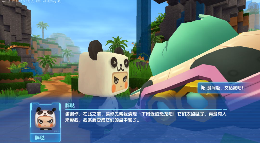 见到冒险家之后的胖哒振作了下精神向我们下达了第一个指令:清理一下附近的恐龙。为了保护胖哒避免成为恐龙的盘中餐,我们接下了任务,开始击败附近的胆小迅猛龙。