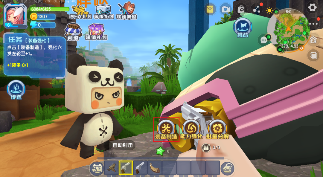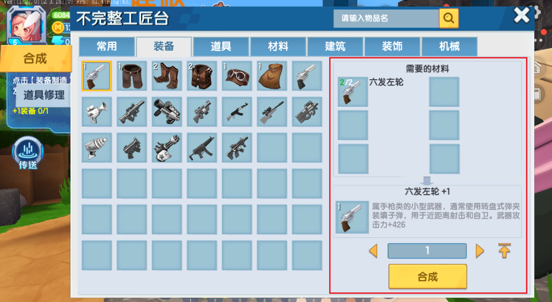 胖哒口中变强的方法就是装备强化。当我们点击装备制造按钮,我们就进入不完整的工匠台界面,在这里我们使用足够的原料就能够制作高级武器和装备。在胖哒的指导下,我们顺利制造除了六发左轮+1。