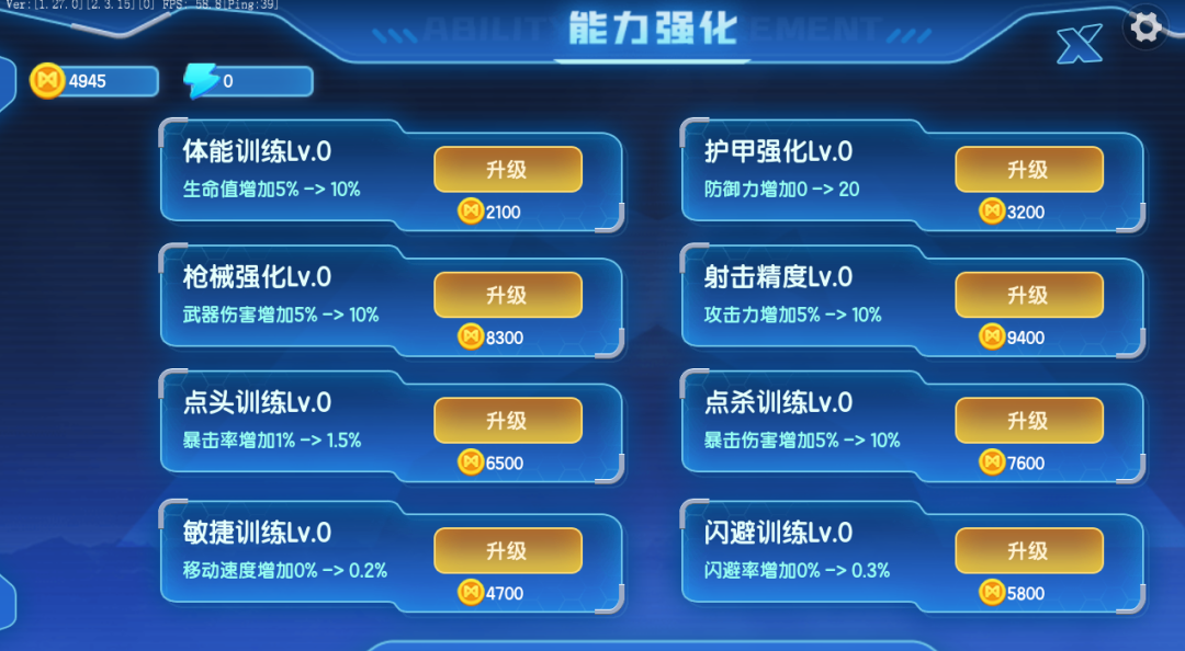 那就是能力强化!我们在点击能力强化图标之后就能进入强化界面。在这里有着体能训练、护甲强化、枪械强化、射击精度等多项能力可供强化,消耗一定数量的金币就能提升相应的能力,让你在与恐龙的作战中更加得心应手。
