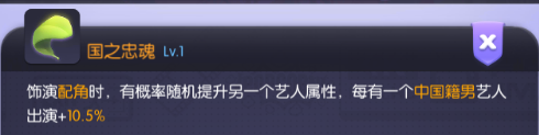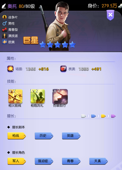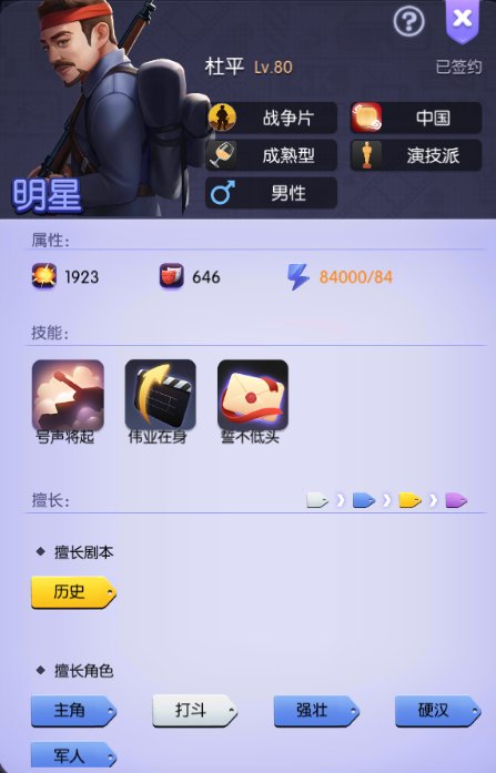 该艺人主要还是为了战争剧而生的,不管是技能属性都是符合战争剧的各项要求,在拍摄“战争剧”的时候也能发挥自身的角色契合性