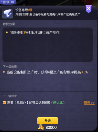 设备等级、打印效率提升也是需要消耗金币的,但一般建议只提升1个打印机,通过时间慢慢生存制作