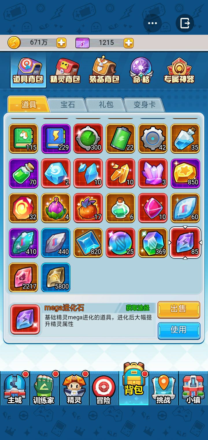 85个mega石,2217个超级进化石,5800个普通进化石。