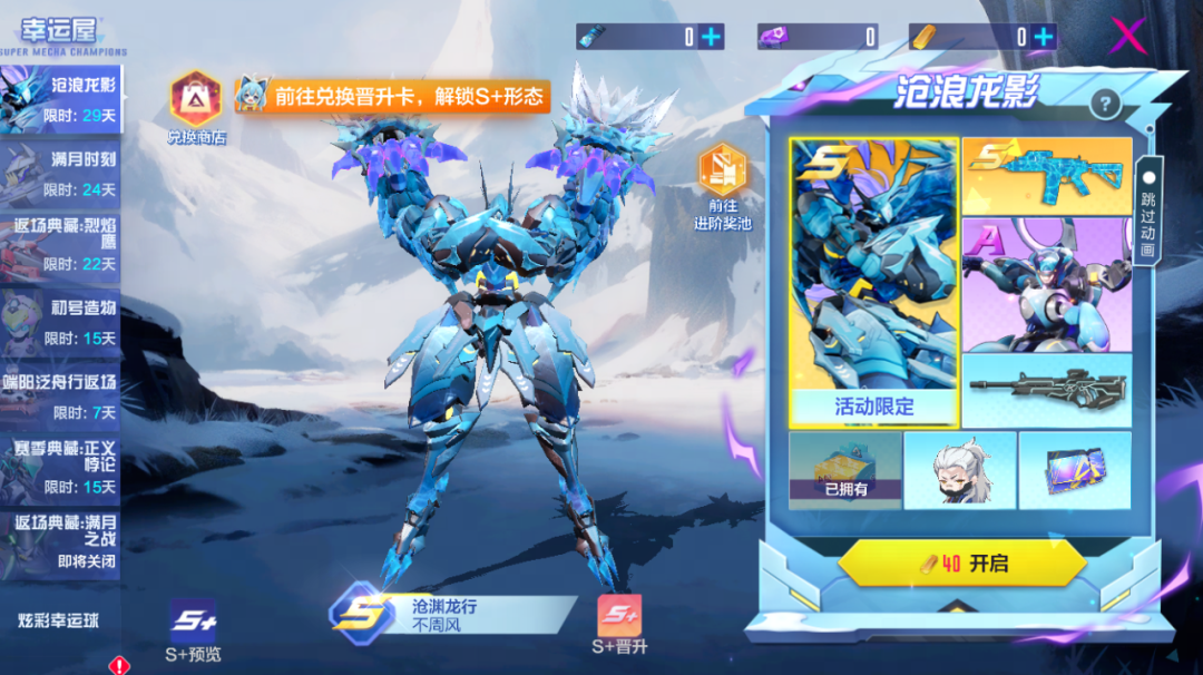 在获得不周风S级外观 “沧渊龙行”后,更可开启进阶奖池,获取外观晋升卡,解锁专属S+形态。