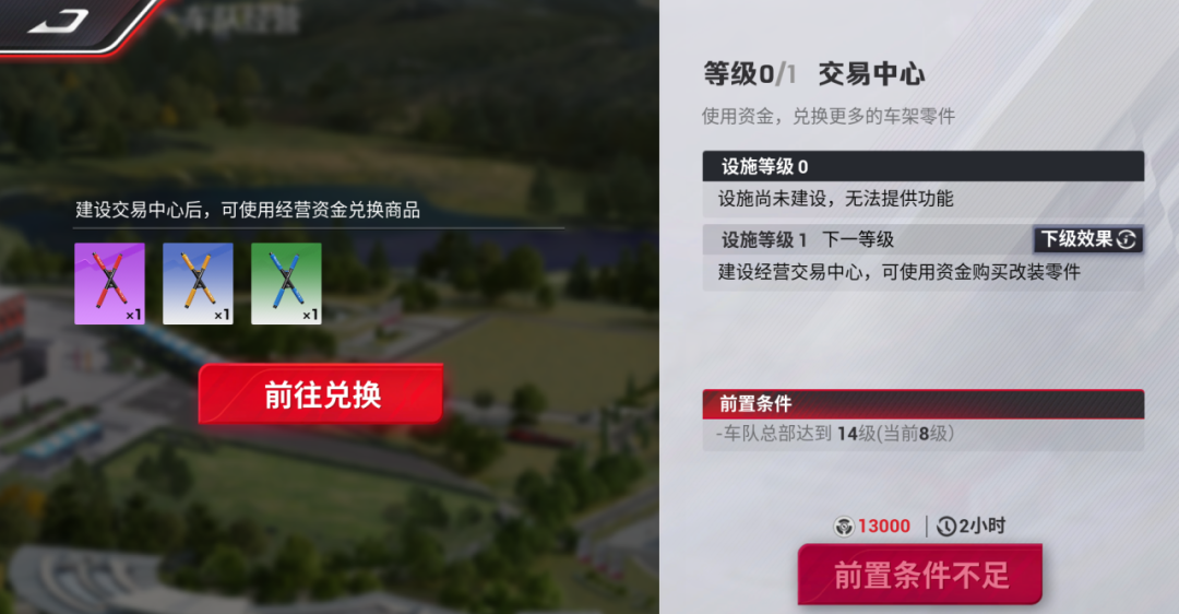「交易中心」是负责为车手们提供更多车架零件的地方,前期需要将车队总部等级提升后才可建设。建设交易中心后,可以使用经营资金兑换零件改装车辆,提升赛车性能,各位车队经理回到车手身份后就能更加快的骋驰飞翔,获取更好的比赛成绩。