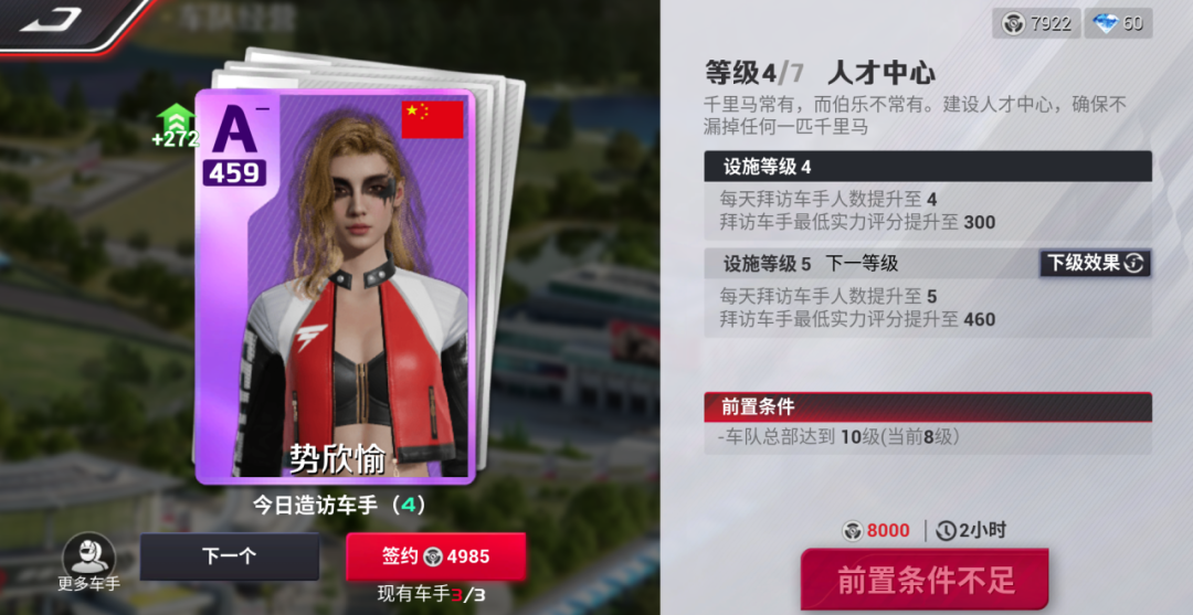 「人才中心」是用作寻找优秀车手的地方,签约优秀的车手将提升【赛事中心】比赛获胜的概率。人才中心的等级提升可以增加每天拜访车手的人数以及实力的评分。