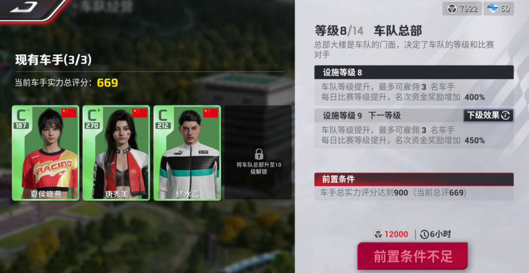 「车队总部」是车队的门面,决定了车队的等级和比赛对手。提升总部的等级可以增加车手每日比赛现金奖励以及扩大车队的规模。推荐各位车手们在前置条件满足的情况下,优先升级总部,这可以让各位车队老板签约更多的高评级车手,更大几率获得比赛冠军,将经营奖励收益最大化。