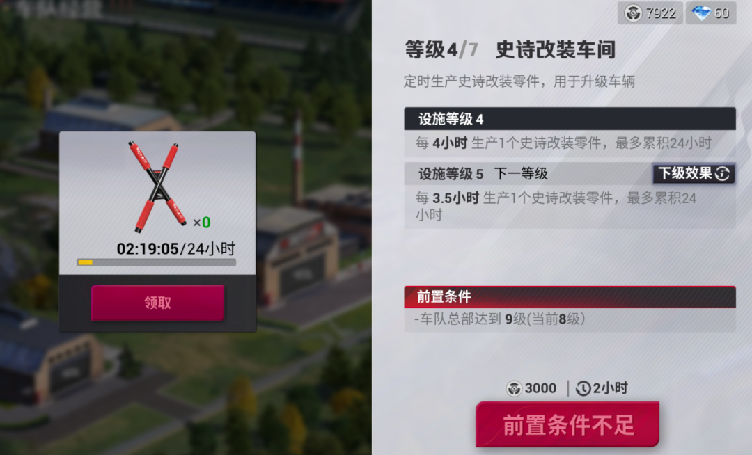 「改装车间」将定时生产各级别的车架零件,用于升级车辆。本板块是生产可以用于车队运营外的资源,车间等级决定了生产车架改装零件的时间。车手们要注意,车间生产的改装零件最多仅可累积24小时。为了保证效益最大化,车手们要记得前往车队收取零件噢。
