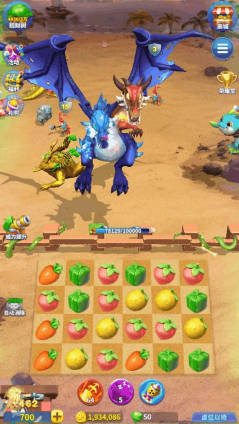 ②解锁水果战士!每次完成四消,有几率随机生成已解锁的水果战士前来助力