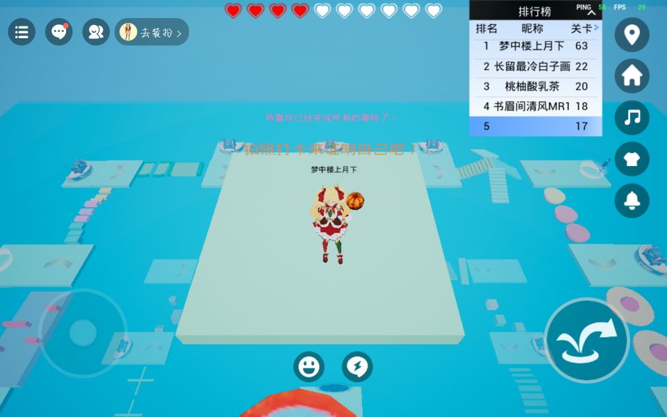 很开心,上面的小红心要保护好,如果掉下去就会减一颗小红心,小红心没有了就不能跳了,必须要看广告复活