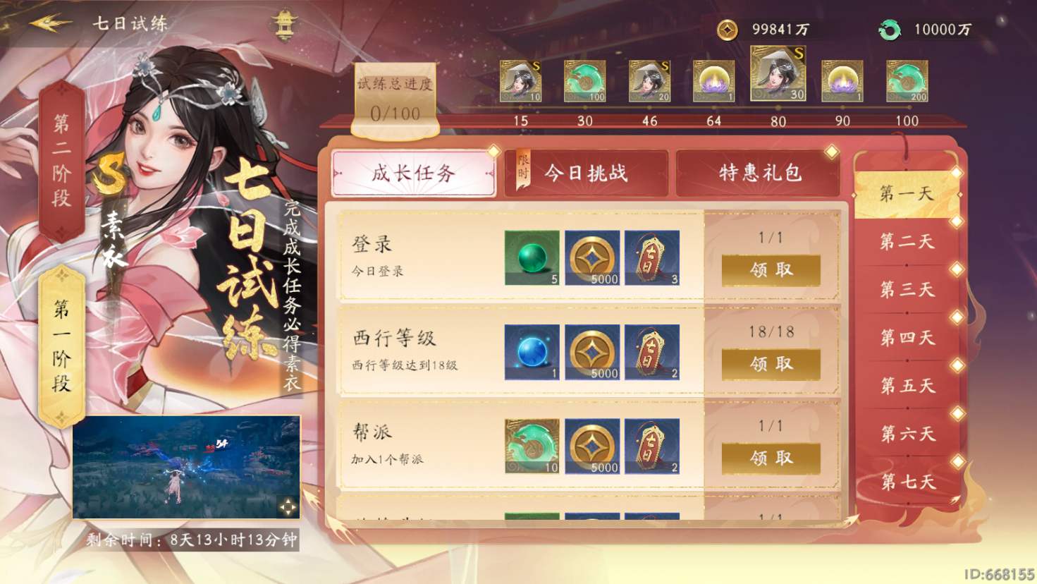 在玩家注册账号后的14天内,每天都有当日限定挑战,当玩家完成7日试炼,即可领取S级英雄素衣,继续完成第二期7日试炼还将得到素衣专属S级神识,更有灵玉、祈愿灯及大量养成资源相送。