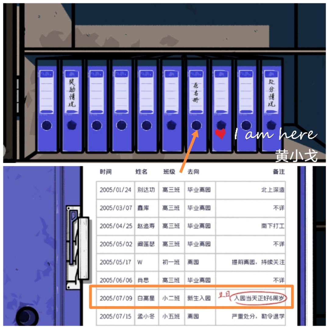 11.打开柜子,查看花名册,发现白高星的生日为07 09