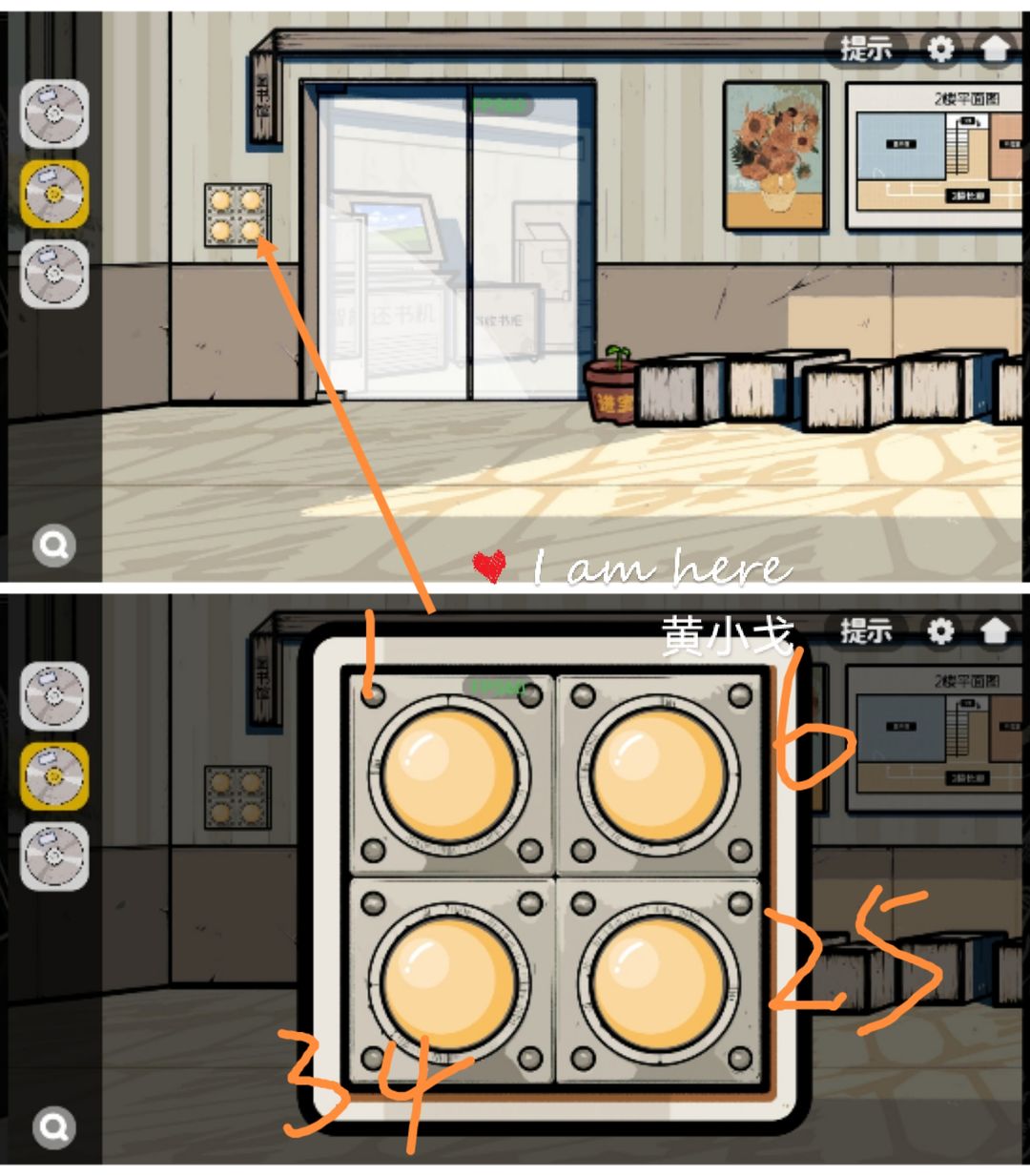 22.(二楼长廊)点击图书馆外面的开关,按143342顺序点击按钮,打开门