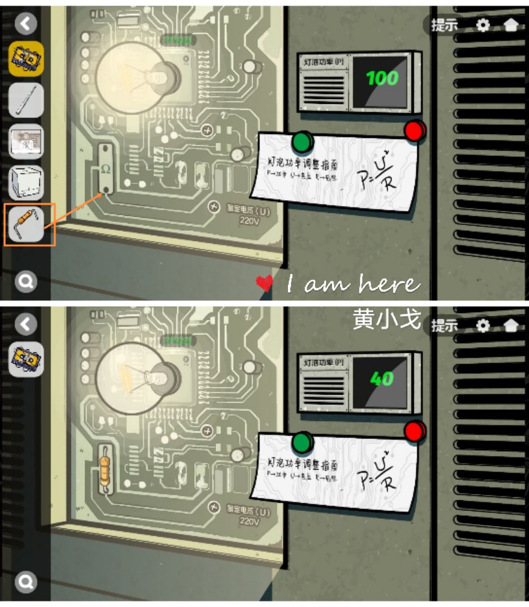 9.点击左下角的机器,放入【灯泡】(显示100功率,220电压和求功率的公式),触发机关