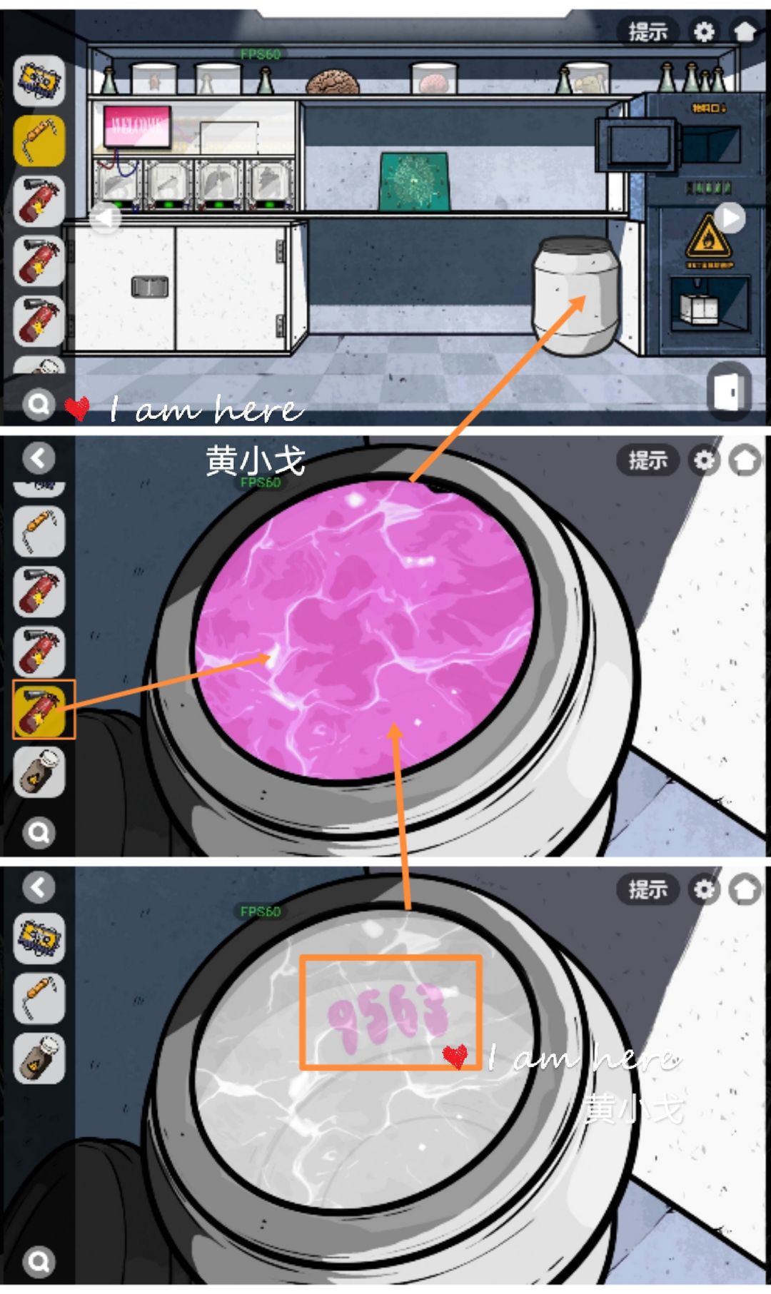 13.(实验室-标本)点击装有酚酞溶液的桶,使用【二氧化碳灭火器】,溶液变透明,获得线索:粉色9563