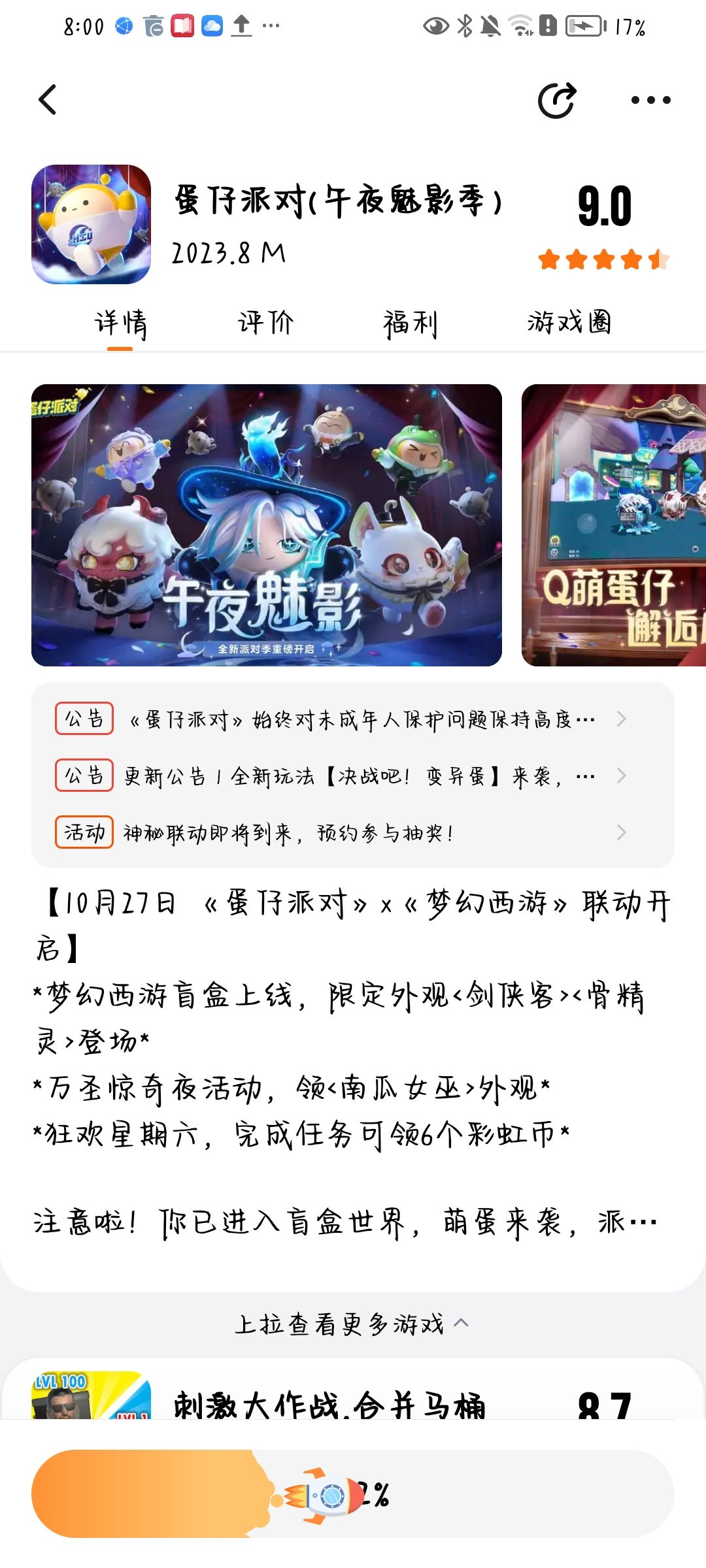 【7月21日 贝贝的登月探险活动开启,免费领<宇航员贝贝>外观】 *夏日狂欢活动上线,免费放送彩虹币!* *<仙人掌丘丘>盲盒上新,<萌兔阿奇>暑期限时返场* 注意啦!你已进入盲盒世界,萌蛋来袭,派对开启!《蛋仔派对》是一款潮玩题材的休闲竞技手游,在这里你将化身Q萌蛋仔,加入热闹非凡的闯关派对。让我们一起撞走不开心,结交好碰友! 海量关卡,陷阱机关,争先恐后往前冲!奔跑、跳跃、翻滚,发生超真实的物理碰撞!百变外观任你搭配,潮流、酷炫、萌趣的盲盒等你收入囊中!更有零门槛地图编辑器,DIY你的专属关卡!