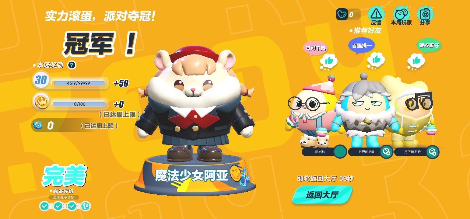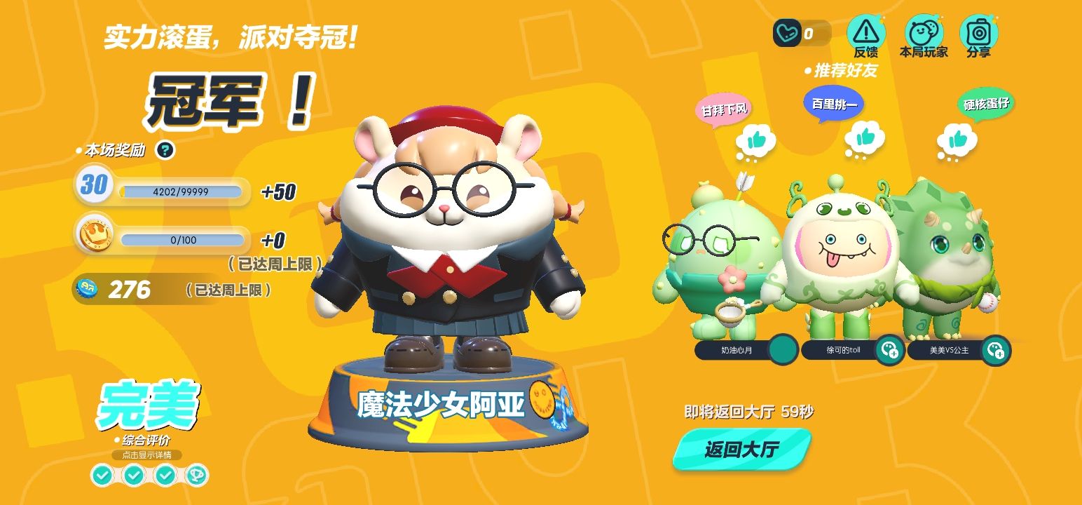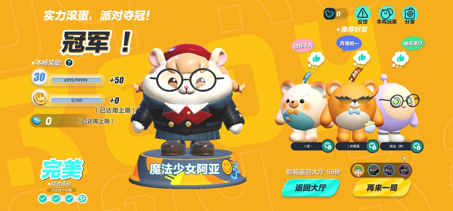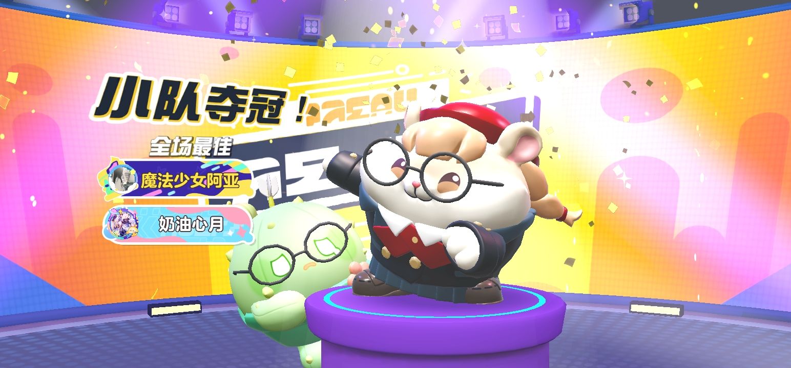 今天和闺蜜,还有闺蜜的同学一起玩四人巅峰派对赢了!