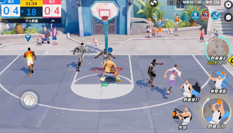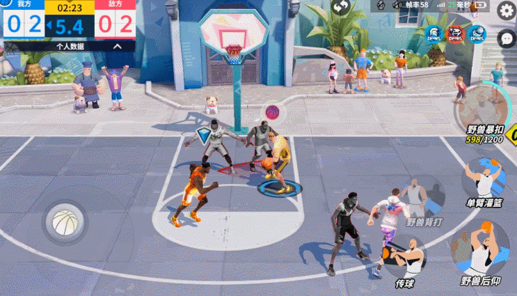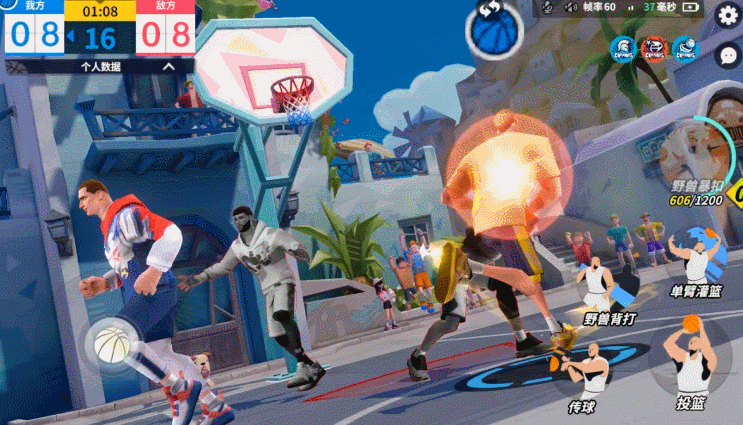 持球进攻时,操作方向键和背打技结合,通过连续的转向晃过对手,然后转身起跳单手劈扣。