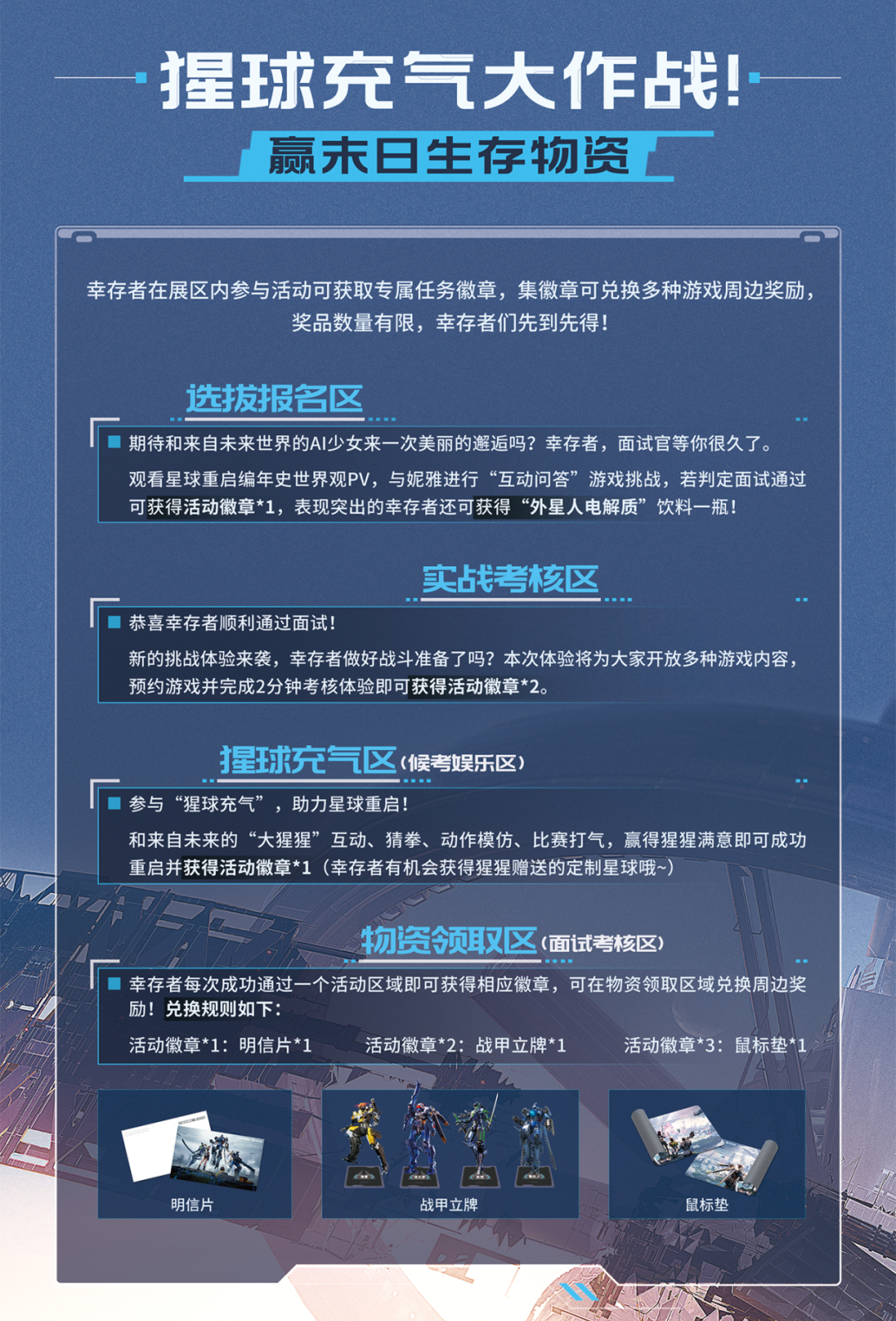 集齐活动徽章,就能召唤战甲?我们还准备了丰富的幸存者物资,获得活动徽章便可兑换战甲立牌、鼠标垫、明信片等周边奖励,戳开下图,看看获得战甲立牌的秘诀~