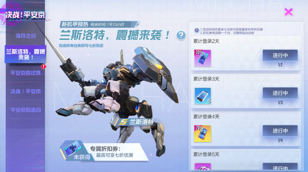 新机甲即将上线!8月3日至8月9日,每日登录领取好礼最高可获得兰斯洛特七折购买折扣券!