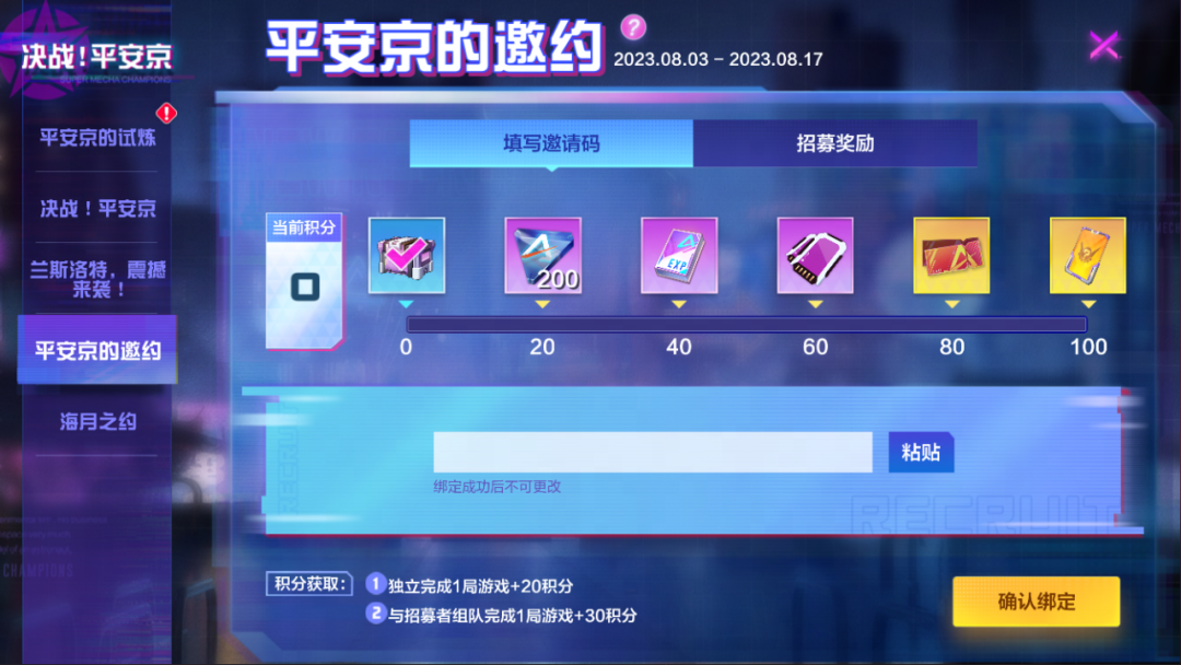 8月3日-8月17日,老玩家分享活动邀请新玩家进入游戏,输入邀请码形成绑定关系,即可一起完成任务获得积分,双方都可获得最终免费奖励“机甲自选卡”!