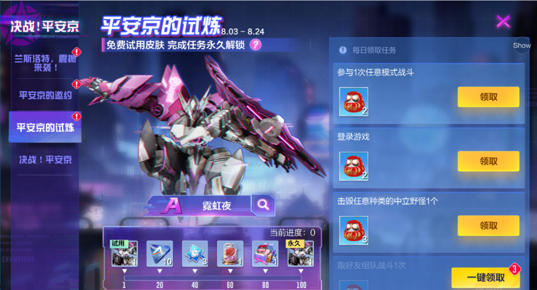 首日可试用千飓A级机甲皮肤,每日累计完成任务,可领永久皮肤!