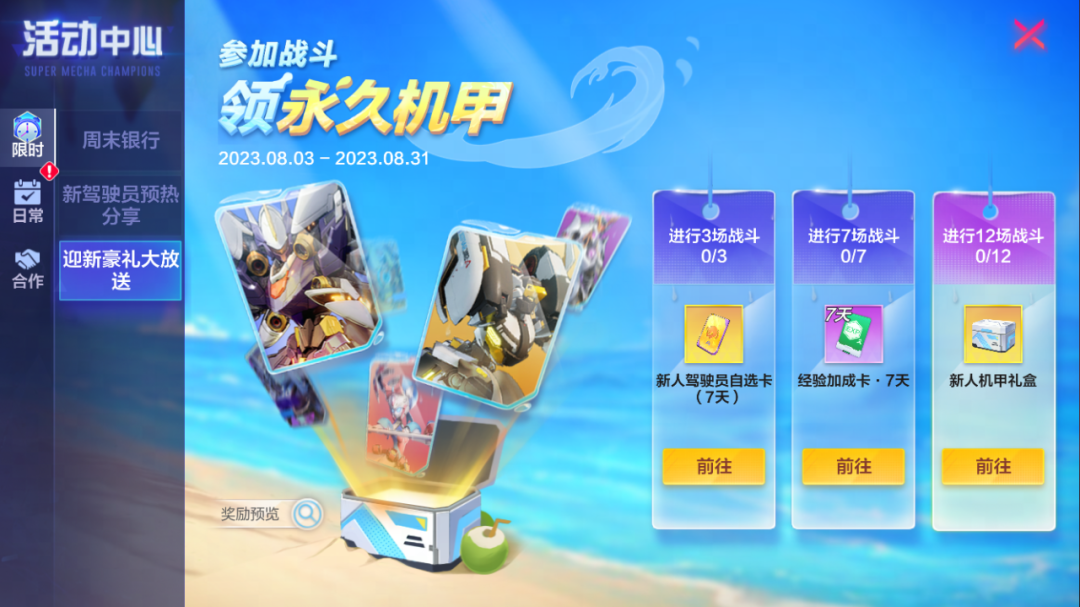 惊喜福利,燃爆暑期!活动期间新注册玩家可通过参与游戏领取永久机甲、驾驶员礼包等惊喜大礼,邀请好友一同作战吧!