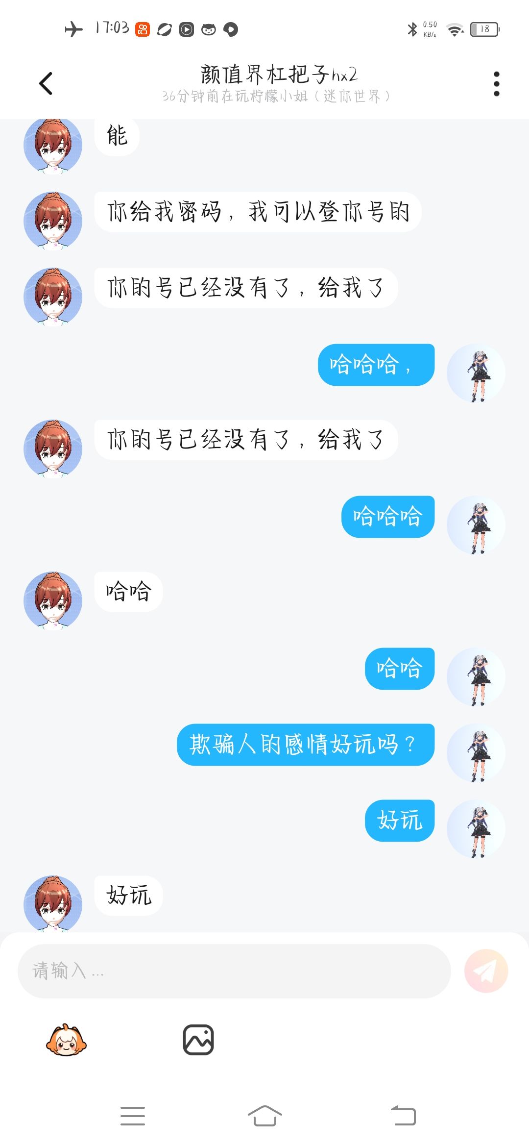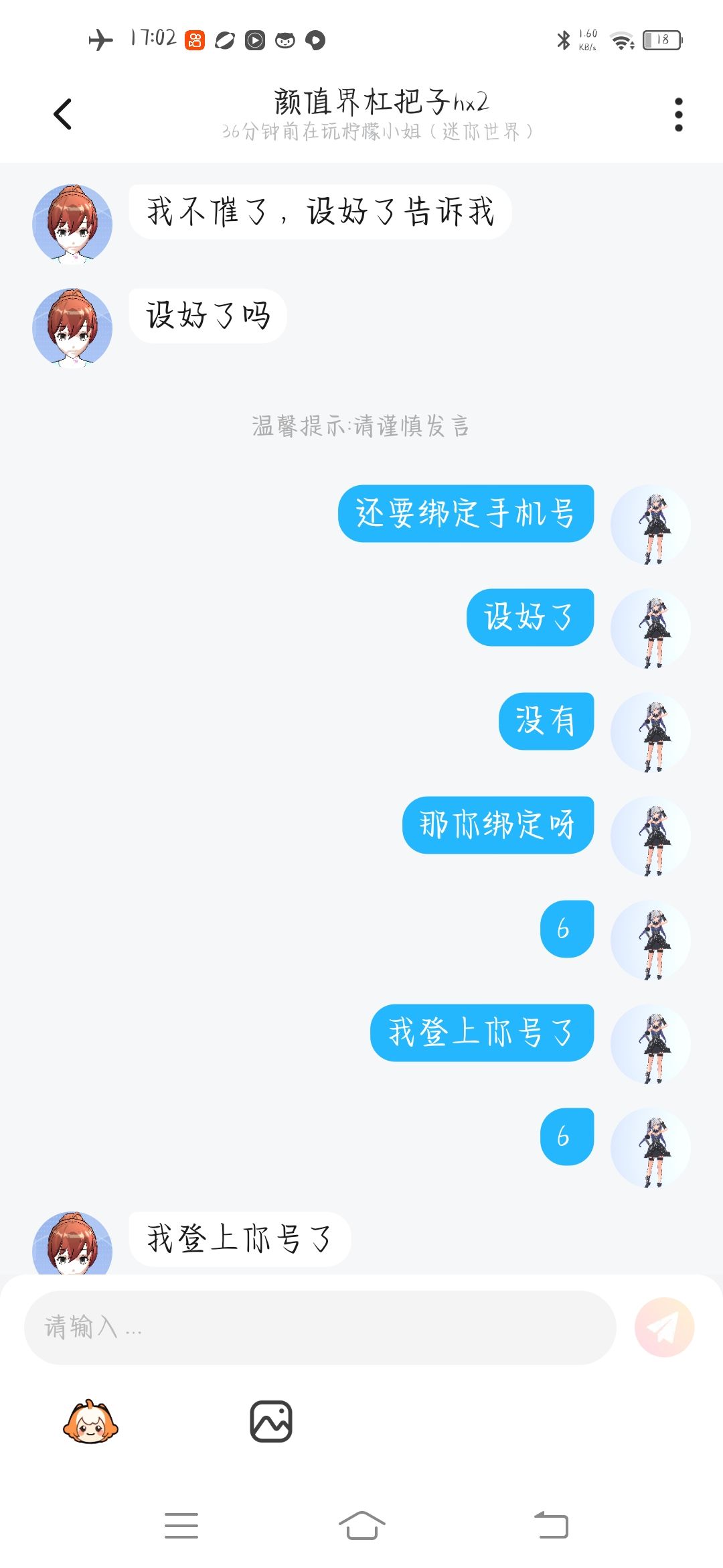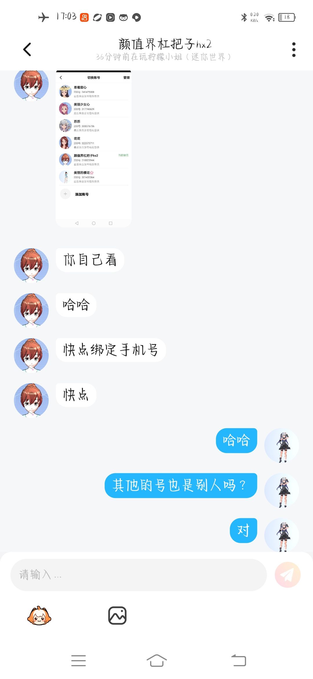 这个人盗我的号,但是我的大号还能说话,我只是绑定密码没绑定手机号,暂时他完全登不了我的号。而且他还登了别人的号。他找我好友聊天的时候我好友问他,你真的会一个星期把他的号还回来,他说永远不会的。这可是好友跟我说的千真万确。