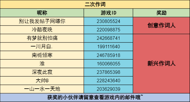 创意作词人(2名):钻石*300、点券*888、白金币*6888