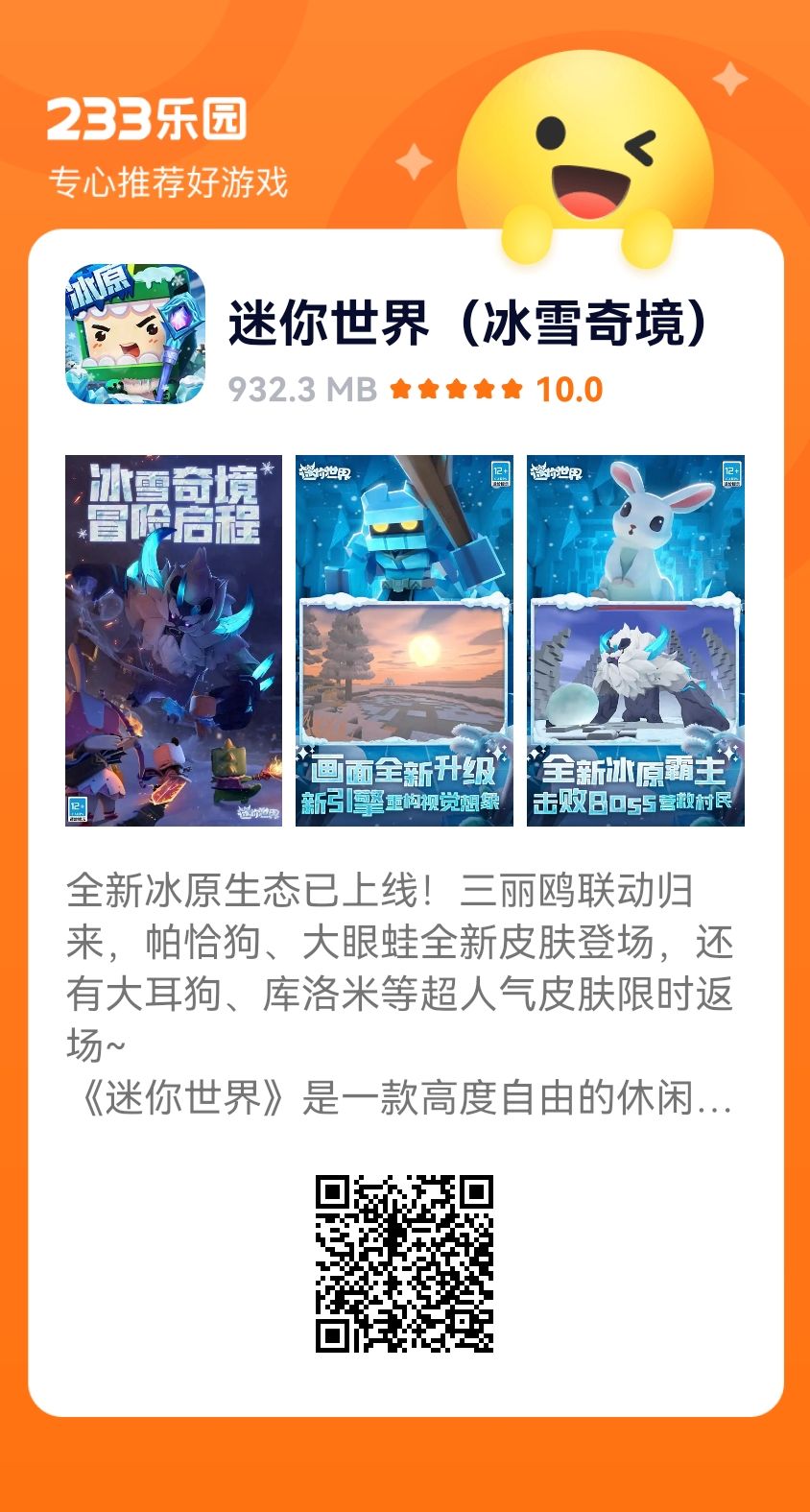 全新冰原生态已上线!三丽鸥联动归来,帕恰狗、大眼蛙全新皮肤登场,还有大耳狗、库洛米等超人气皮肤限时返场~ 《迷你世界》是一款高度自由的休闲益智型3D沙盒游戏,有着非常方便快捷的多人联机模式,只要有网络就能和各个地方的小伙伴们一起玩,不只局限于局域网内的小伙伴哦!这里没有等级和规则限制,没有规定的玩法,只有随心所欲的破坏和天马行空的创造!