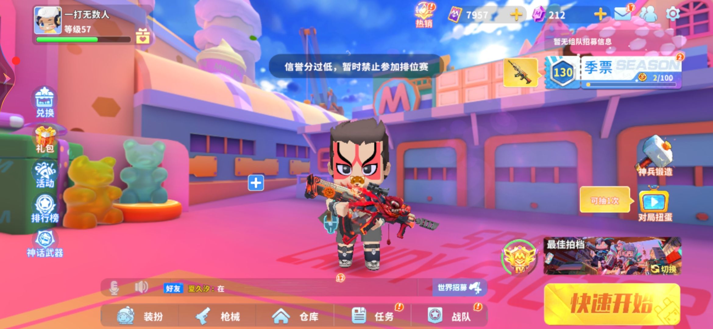 你们谁能带我呀,我的信誉分儿比较低,所以就开不了,还有的时候麦克风也开不了,你们没有人单挑是我的对手