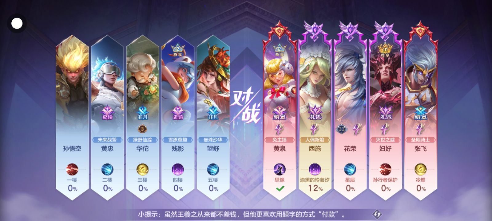 黄泉还差最后一个皮肤,哪样都缺少传说皮肤。王昭君、貂蝉、桑榆、杨玉环、蔡文姬、我样样都缺少传说唉