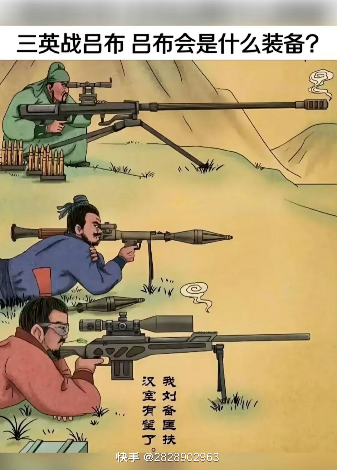 我就搞不懂,三英战吕布,古代人有枪吗?关羽的是青龙偃月刀。张飞的是丈八蛇矛。刘备的是双骨剑。吕布的是光天华戟。为什么三英们为什么用的是机枪不用武器?不知道吕布用的是什么?