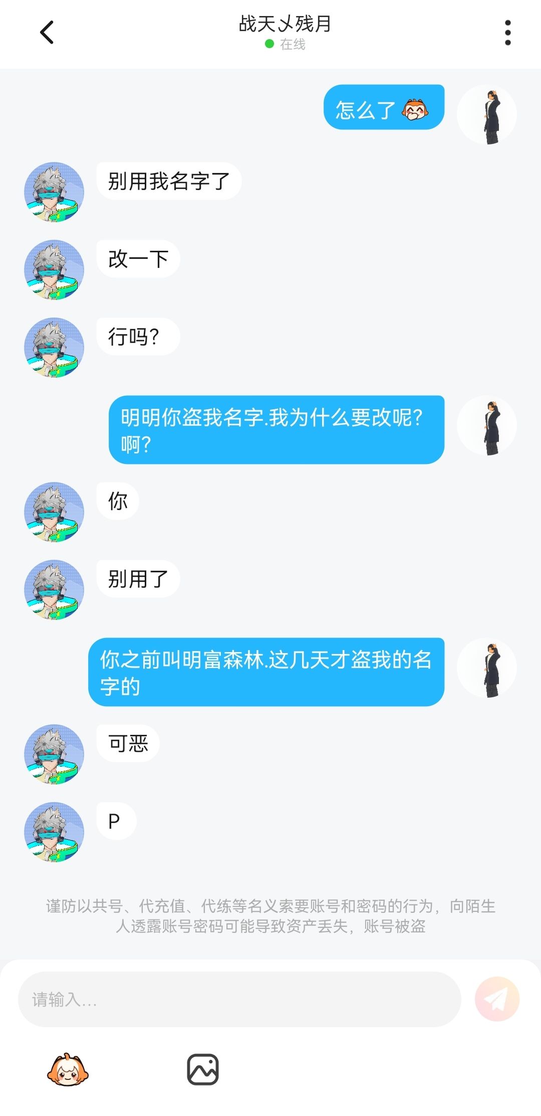 虽然你盗我名字我不计较.但密也不至于叫我爷爷爸.盗了名字就盗.别在这骂你家里人了.唉.算了吧.看你可怜.我限你在24小之内改掉名字.别和我用一样的