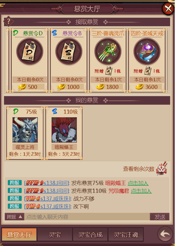 7.悬赏系统:多人PVE跨服互动玩法,玩家每天可免费领取一张悬赏令,也可以花元宝直接购买悬赏令,然后可选择自己想要发布的悬赏令进行悬赏发布:发送世界聊天、发送公会聊天、发送跨服聊天等等,邀请小伙伴一起砍Boss。悬赏令发布在跨服聊天,可邀请其他服的大佬,一起合作,击败悬赏BOSS,掉落丰富的灵宝装备和灵宝强化材料以及高级悬赏令。