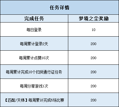 活动期间,每日登录游戏即可领取梦境之尘*10,每周完成相应的任务,还将收集到更多的活动代币。活动时间持续一个月,小伙伴们通过完成任务最多可收集到梦境之尘*4280哦!