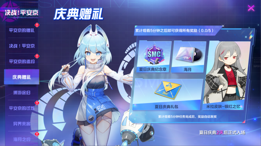 观看夏日庆典累计五分钟,即可获得米拉A级外观“银红之忆”、夏日庆典纪念章、大厅音乐“海月”以及夏日庆典礼包!