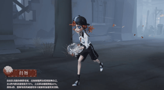 拉拉队员随身携带花球,点按按键挥动花球鼓舞自己,在4秒内移动速度提升70%,之后移动速度降低40%,持续4秒。鼓舞导致的减速效果可被新的加速效果清除。