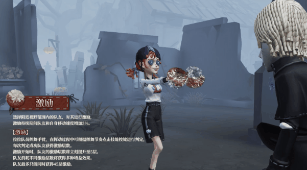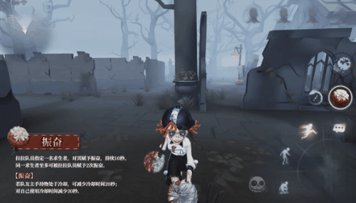 拉拉队员指定一名求生者,对其赋予振奋,持续10秒。同一求生者至多可被拉拉队员赋予2次振奋。