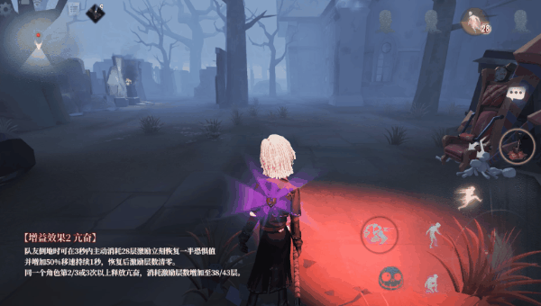 队友倒地时可在3秒内主动消耗28层激励立刻恢复一半恐惧值并增加50%移速持续1秒,恢复后激励层数清零。同一个角色第2/3或3次以上释放亢奋,消耗激励层数增加至38/43层。