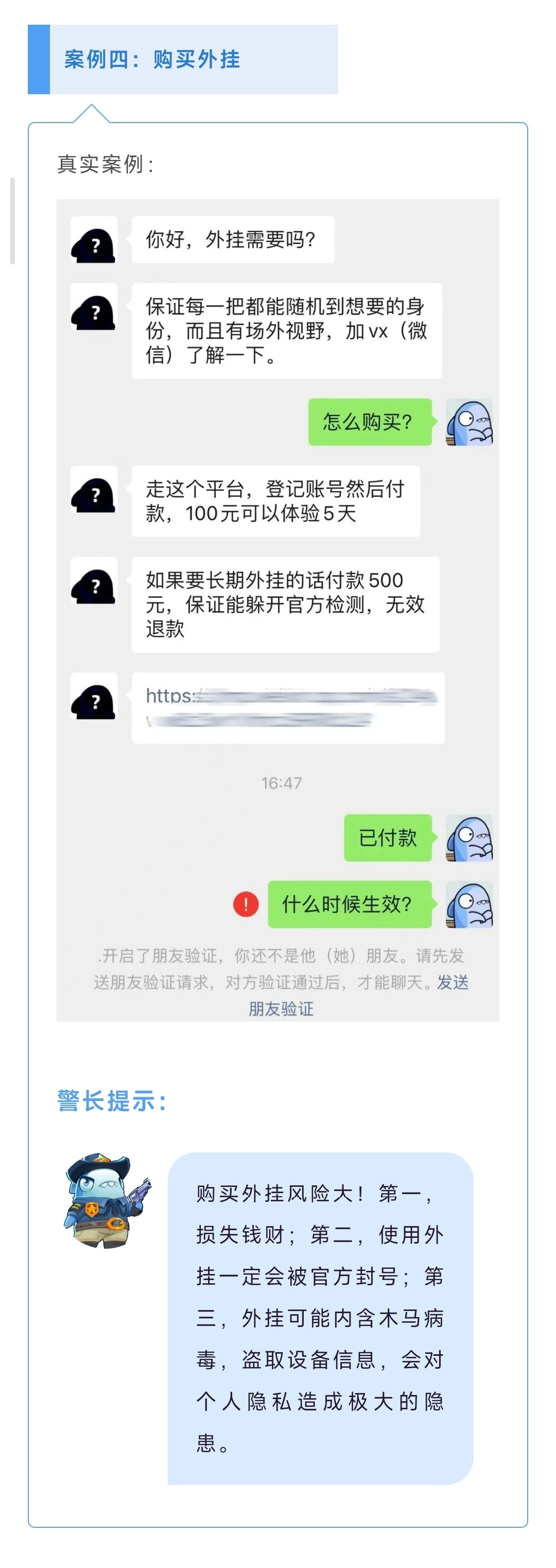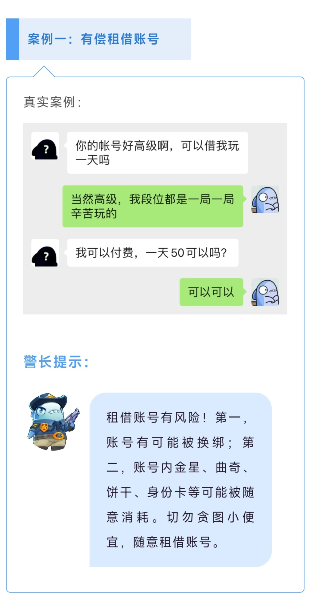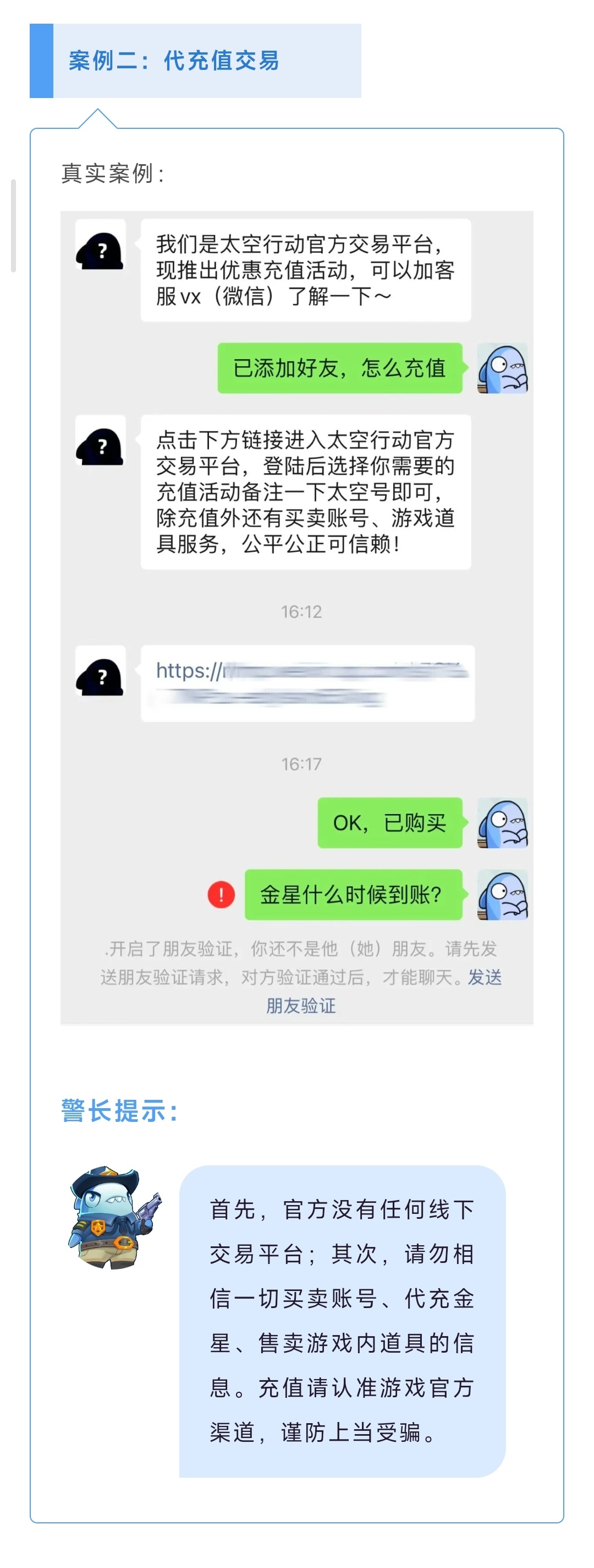 骗子经常以与账号等级不对等的高金额作为诱饵,利用玩家单纯、虚荣的心理诱导交易,交易后又通过层层理由拒绝账户提现,最终钱和游戏账号都打水漂了。警长提醒大家,私下交易不能信,谨防钓鱼网站和虚假交易网站。