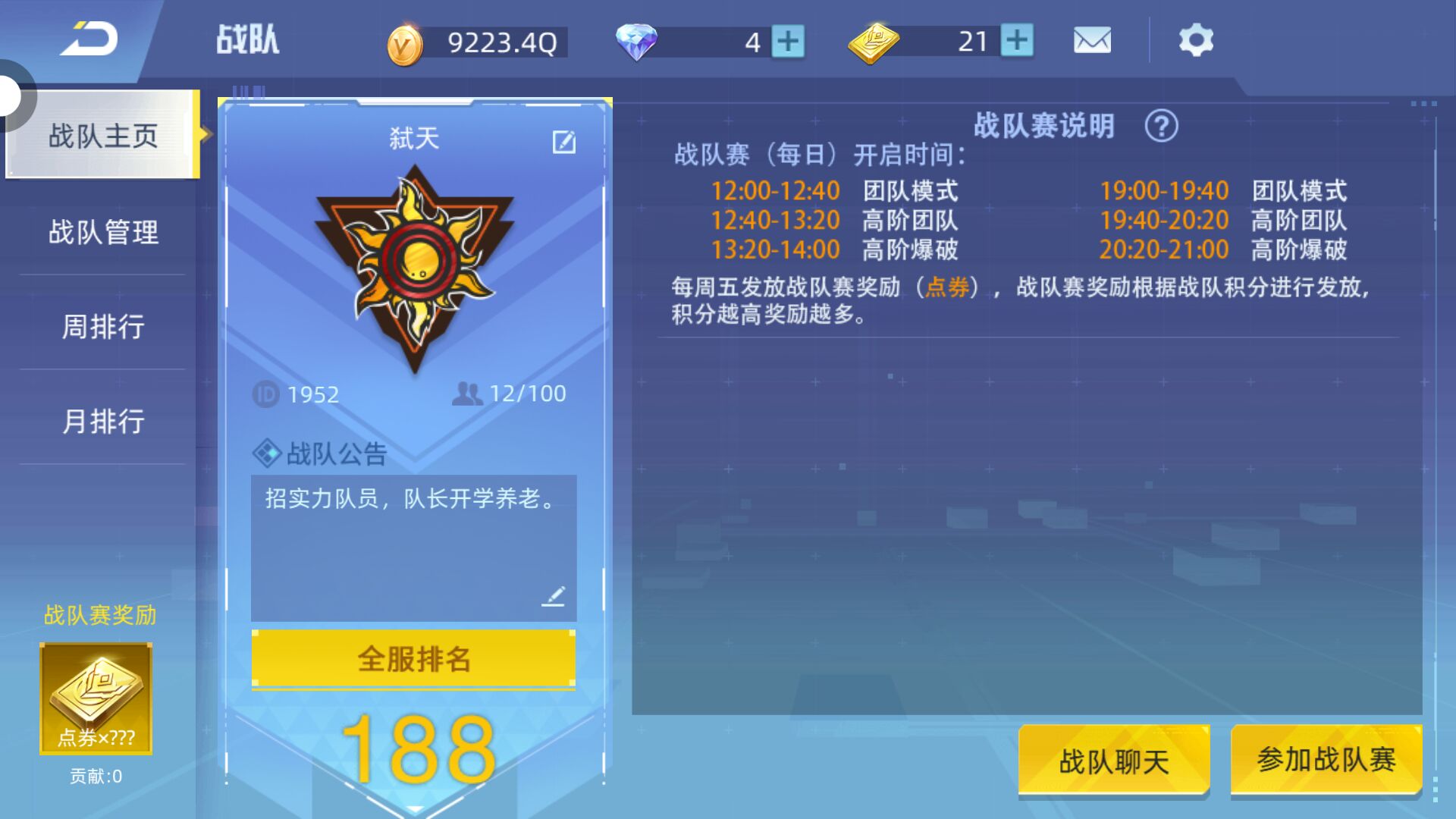 弑天战队招人,ID1952,欢迎各位大佬进队,根据实力评选副队,60贡献一点券。