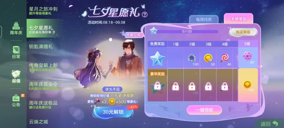 七夕星愿礼甜蜜开启中,8月18日-9月8日,活动期间,仅需30元即可解锁豪华奖励!更有史诗皮肤、超大奇妙宝箱钥匙等海量甜蜜好礼哦~