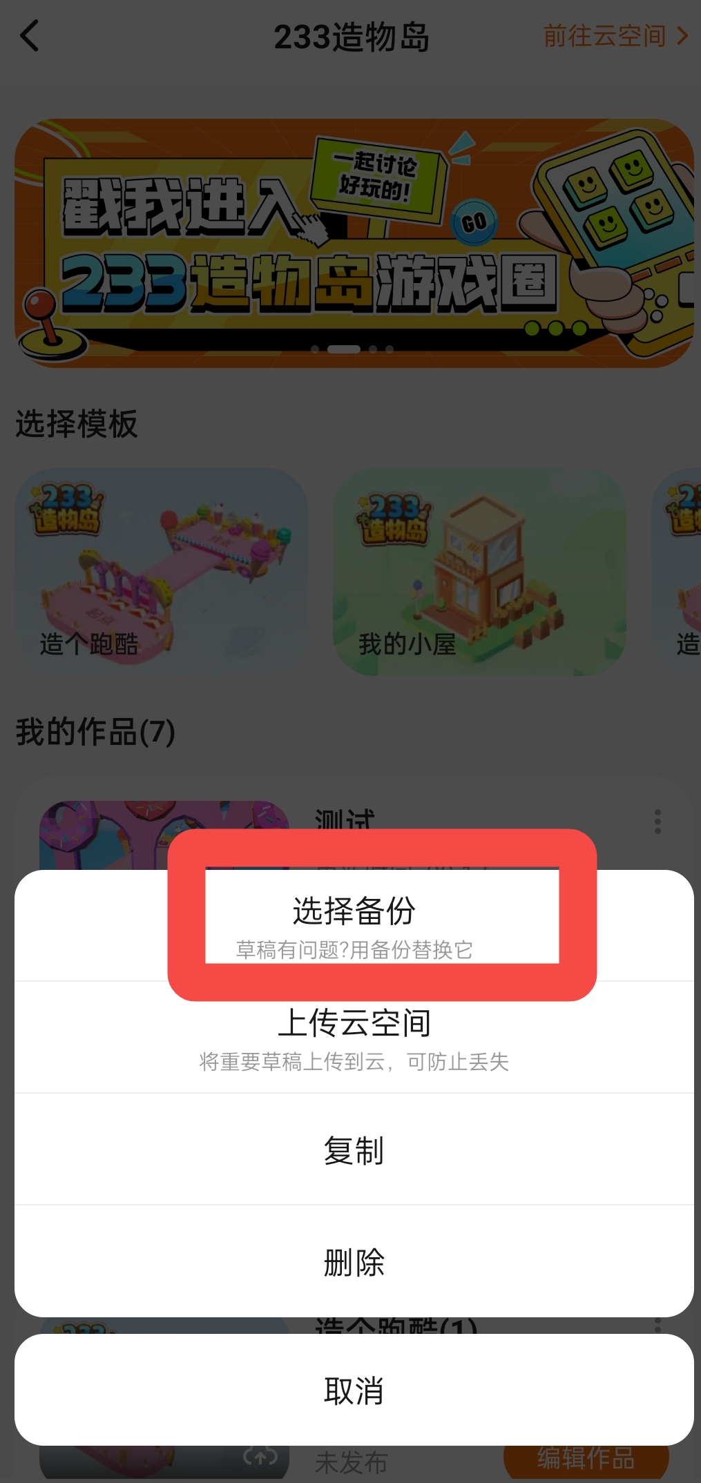 点击作品存档右上角的三个点,选择备份,就可以通过备份存档选择回到作品十分钟甚至二十分钟之前的样子,再也不怕突然出现的bug了!(建造作品每十分钟会自动保存一次备份存档,少于十分钟的作品没有备份)