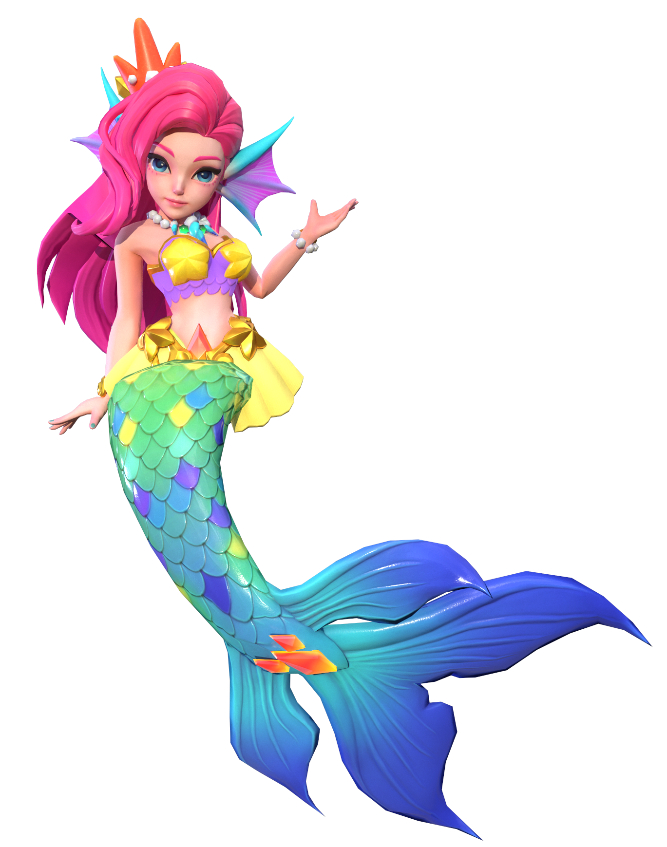 粉发碧眼,蓝绿色的长尾婀娜多姿。虽是深海娇媚的公主,力量却不可小视。
