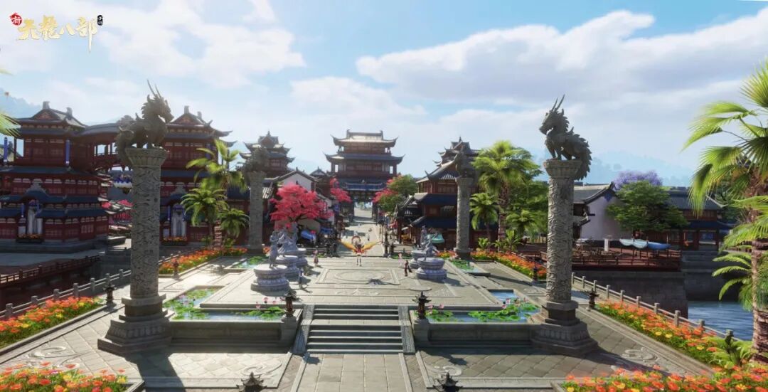 在新天龙的大理场景中,我们对大理做出了更细致的优化。江湖中大理的街道上出现了云南大理特有的少数民族服饰乘坐大象的乘客。还有我们熟悉的麒麟石柱与曾经100%交谈过的NPC门派接引人也在临江台处,等待你“回家”。