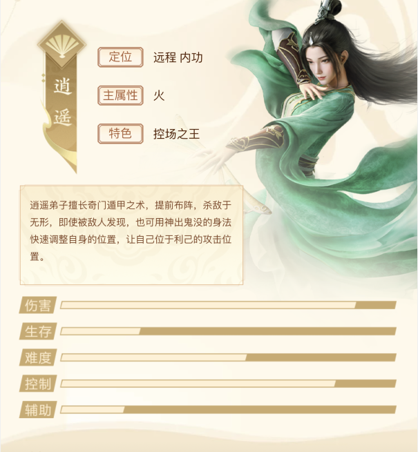 作为内功门派,逍遥擅长火属性攻击。无论是单体爆发还是群体输出都十分优秀。凭借溪山行旅的放大技能,在副本和pvp都是十分抢手的门派。