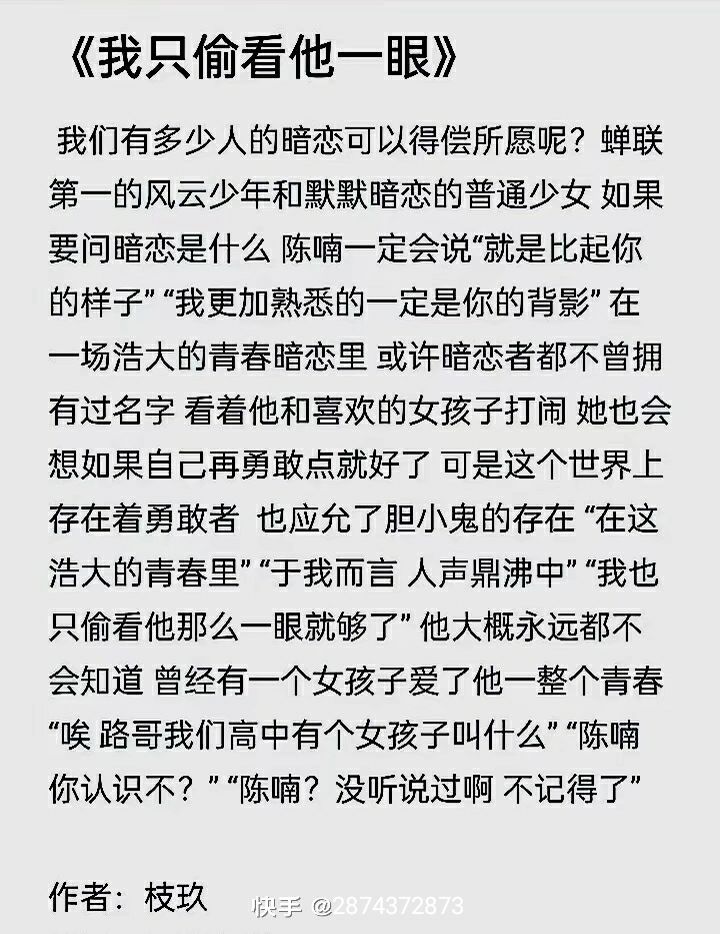 《我只偷看他一眼》怎么说呢?看的那天,眼泪没停过,都哭肿了,不爱看虐文的可以推荐看《向盛夏》挺甜的