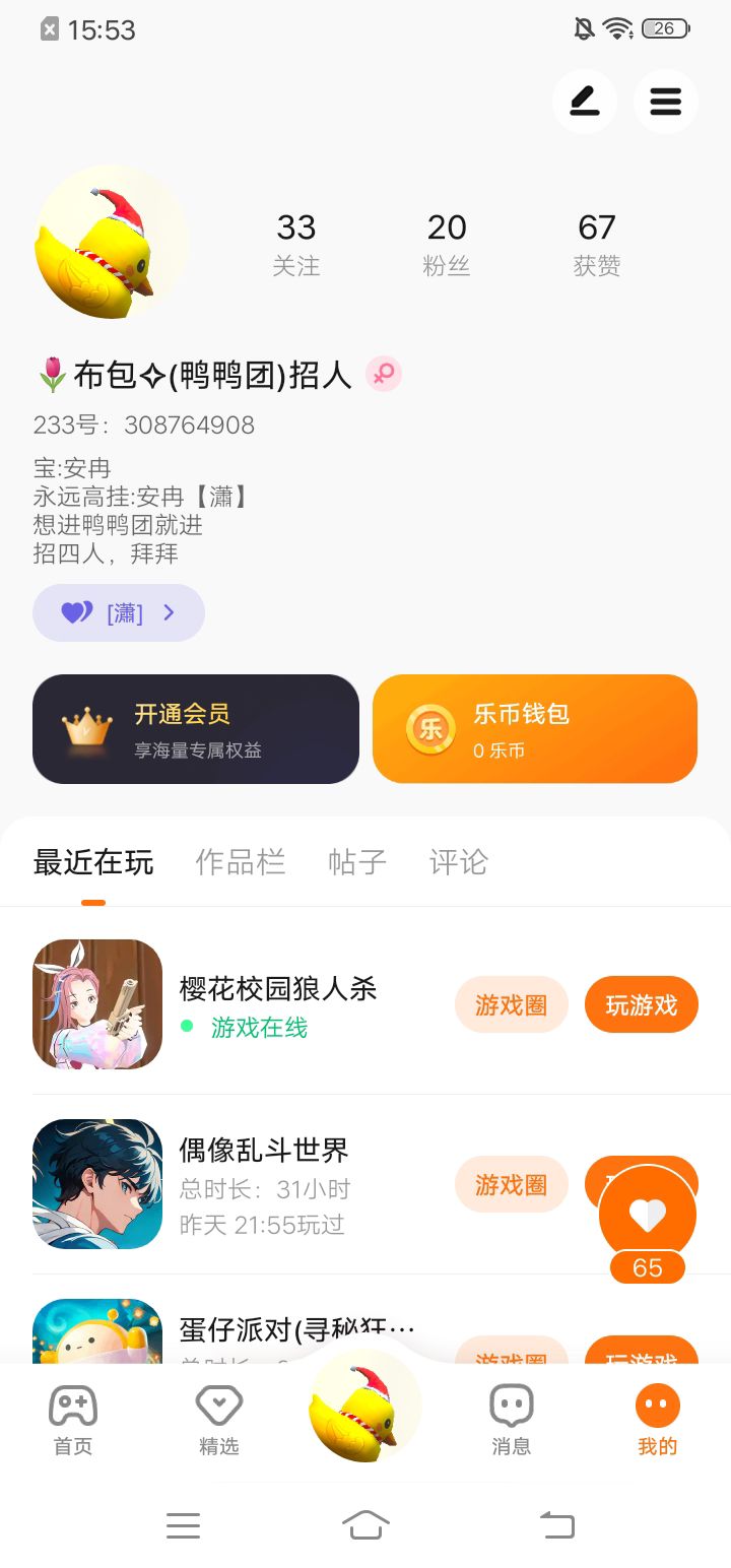 想进鸭鸭团就进 招四人(可以不穿鸭鸭) 但要先加好友 名字要加(鸭鸭团) 主页也要写
