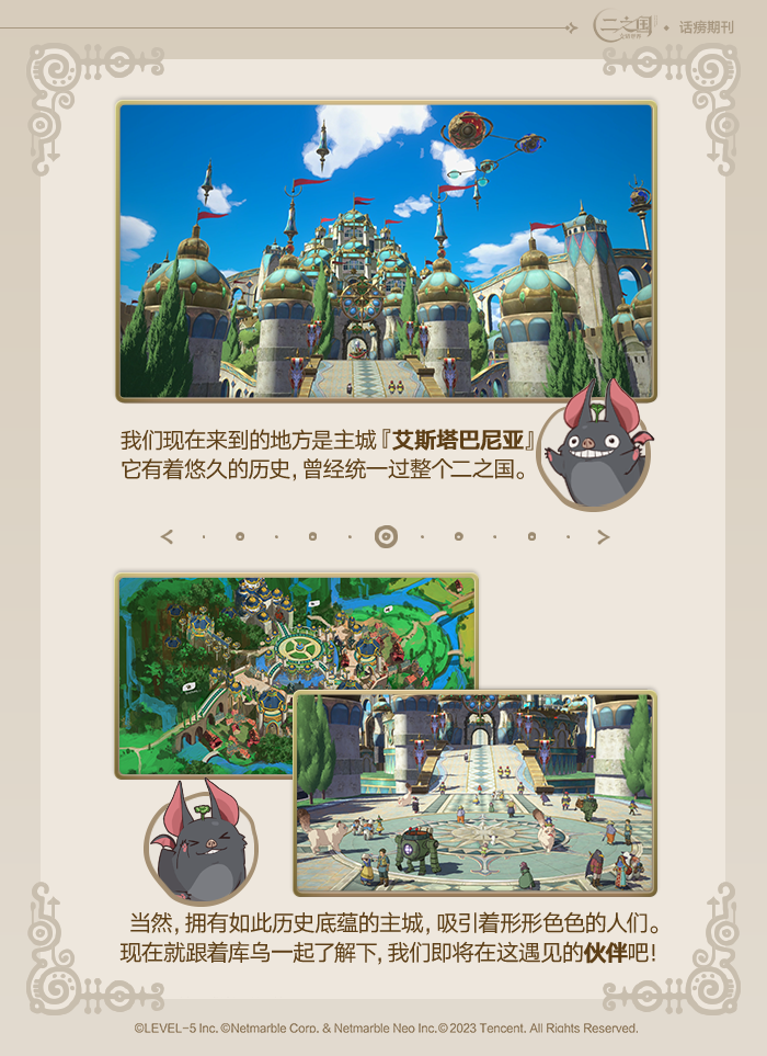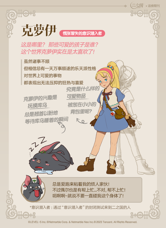 冒险家大人通过“意识潜入者”选拔,从千万人中脱颖而出,踏上这片广袤神秘的大地。想要在这神秘的二之国闯荡,留下一份美好的异世界回忆,一个人的力量怕是孤木难支。不要怕,跟着库乌大人一起进入艾斯塔巴尼亚,在这历史悠久的辉煌城邦里邂逅知心的伙伴,在他们的引导下开启一段美妙的冒险吧!