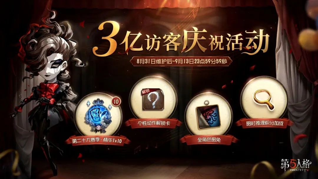 ——欧利蒂丝庄园现已迎来3亿访客!为了感谢诸位访客的到来,庆祝活动将于8月31日维护后开启。活动期间登录游戏的访客们将获得【第二十九赛季·精华1*10】,完成任务还可获得个性动作解锁卡、友情点等奖励;